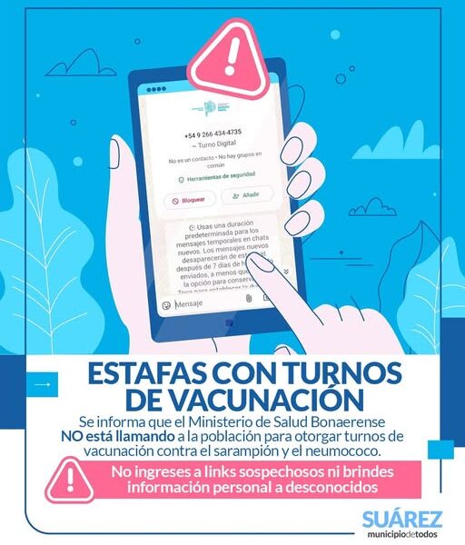 ❌ No ingreses a links sospechosos ni brindes información personal a desconocidos. Están intentando estafar a vecinos con falsas convocatorias a turnos de vacunación.