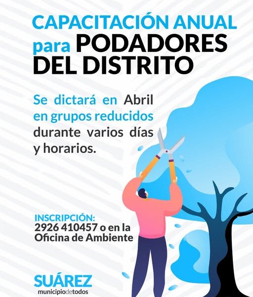 Desde la Subdirección de Ambiente, dependiente de la Jefatura de Gabinete, se informa que durante el mes de abril se realizará la capacitación anual para podadores particulares, de carácter OBLIGATORIA, ya que a partir de estos encuentros se confeccionará el registro municipal de podadores habilitados, en cumplimiento con la Ordenanza Municipal Nº 7550.