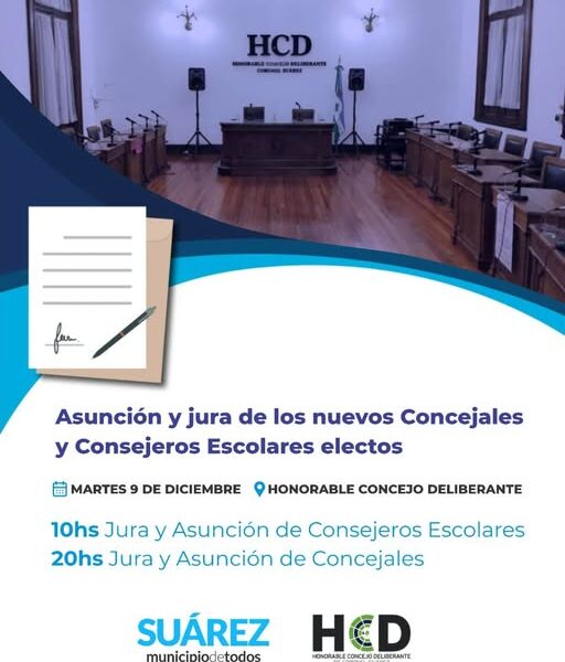 Ese mismo día, a las 20 horas, en el recinto del Deliberativo Suarense, se realizará la ceremonia de asunción de los Concejales que integrarán el cuerpo legislativo a partir del nuevo período. Durante la sesión, se procederá además a la elección de las nuevas autoridades del Concejo Deliberante.