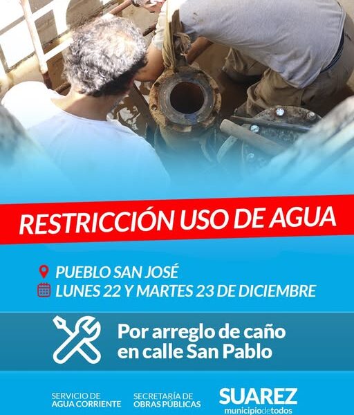 Se solicita a los vecinos y vecinas de Pueblo San José que durante los días lunes y martes realicen un uso responsable del agua, evitando cargar piletas y regar, debido a que se están llevando adelante trabajos de reparación por una rotura de cañería en calle San Pablo.