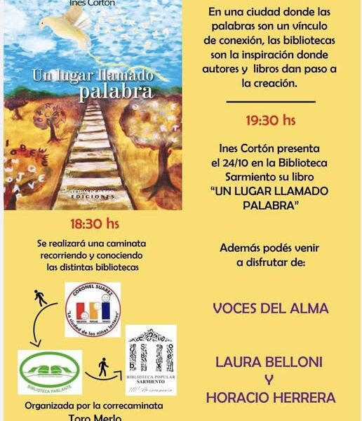 📢La actividad es organizada por la correcaminata Toro Merlo, y tendrá como punto de partida la Biblioteca Infantil, continuando por la Biblioteca Parlante para finalizar en la Biblioteca Popular Sarmiento, donde a las 19:30 horas, la escritora Inés Cortón presentará su libro “Un lugar llamado palabra”.