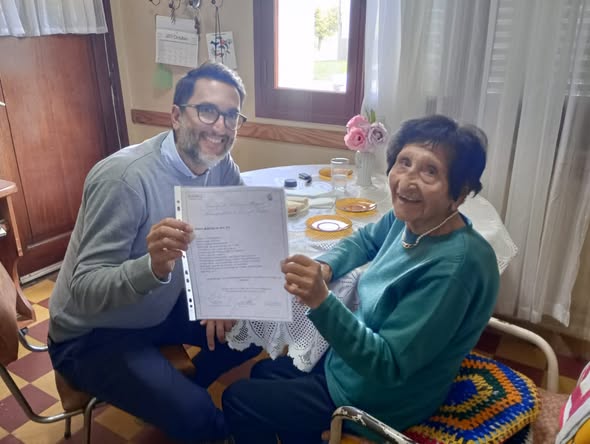 👥El secretario de Gobierno Gastón Duarte, junto al director del área, Osvaldo Lezica, visitaron a María para acercarle el saludo especial del Intendente Ricardo Moccero, reconociendo en ella un verdadero ejemplo de vida, humildad, compañerismo y amistad.