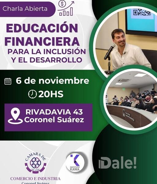 Será este jueves 6 de noviembre a las 20 en instalaciones de la Cámara de Comercio e Industria de Coronel Suárez (Rivadavia 43), en el marco del programa DALE que impulsa la senadora Nerina Neumann Losada junto al Instituto Kawa (Academia de Educación Financiera), y la mencionada Cámara local. La charla es abierta y gratuita.