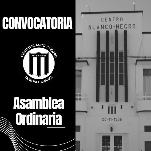 Coronel Suárez, 19 de Octubre de 2025. Convocase Asamblea General Ordinaria a los señores socios de la asociación civil Centro Blanco y Negro el día 02 de Noviembre de 2025, a las 10.00 hs, en primera convocatoria, y a las 10.30 hs en segunda convocatoria, en la sede social de la entidad, sita en la calle Mitre esquina Garibaldi, de la Ciudad de Coronel Suárez, a los efectos de considerar el siguiente orden del día: