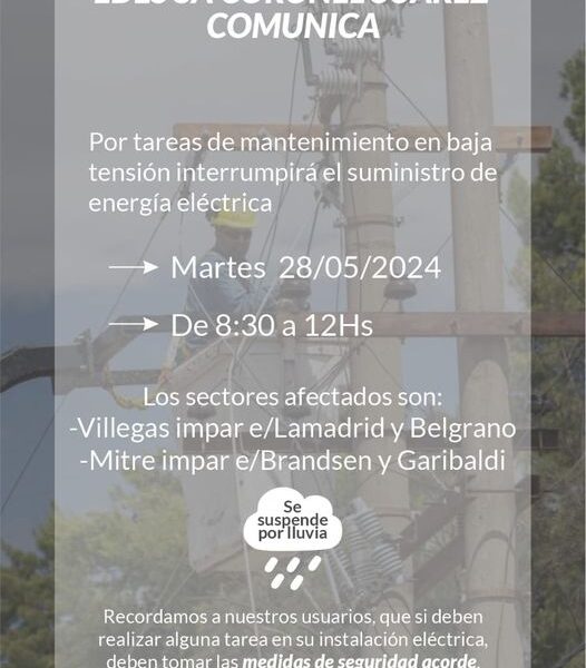 Edes SA Sucursal Coronel Suárez comunica a sus usuarios que por tareas de mantenimiento en baja tensión interrumpirá el suministro de energía eléctrica el día martes 28/05/2024 desde las 08:30hs hasta las 12hs.