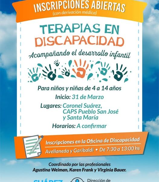 La Dirección de Discapacidad informa que se encuentra abierta la inscripción a “Terapias en Discapacidad”, un espacio destinado a acompañar y fortalecer el desarrollo integral de niños y niñas, a través de abordajes terapéuticos específicos.