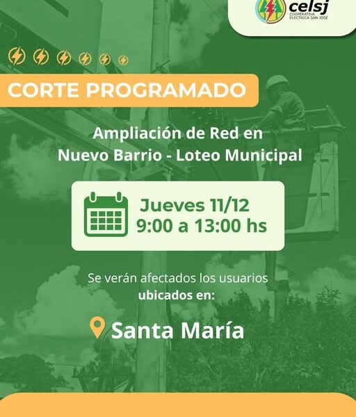 Informa la Cooperativa de los Pueblos Alemanes que por tareas de ampliación de red en el nuevo loteo municipal, se efectuará un corte en el servicio eléctrico que afectará todo Santa María, desde las 9 y hasta las 13hs.