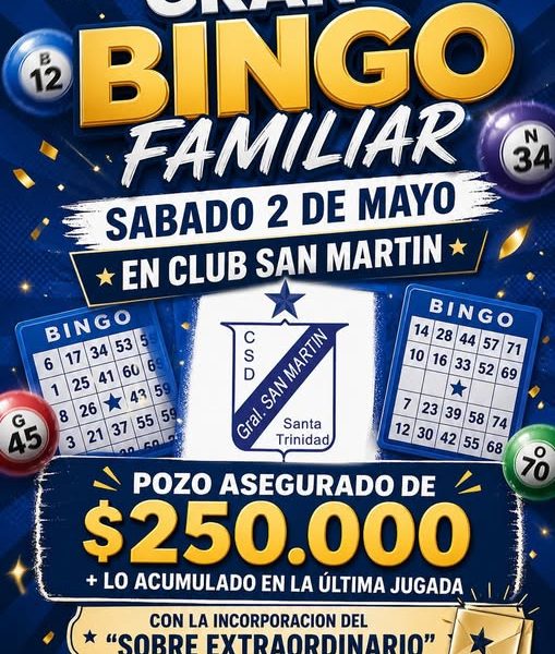 Este sábado 2 de Mayo, en el Club San Martín de Santa Trinidad. Interesantes pozos, la incorporación del sobre extraordinario y esmerado servicio de cantina. La primer jugada se va a desarrollar a partir de las 21.30.