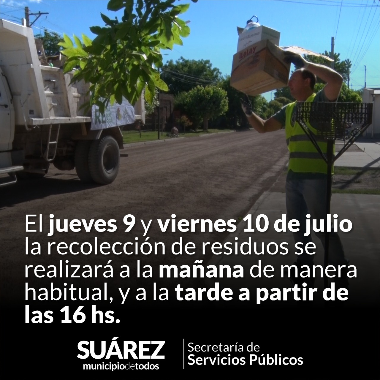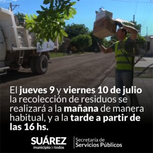 La secretaría de Servicios Públicos informa que los días jueves 9 y viernes 10 de julio, feriados, la recolección de residuos en horario matutino funcionará normalmente, mientras que la recolección vespertina se realizará a partir de las 16.