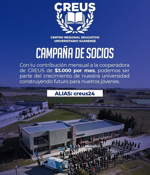 🏫Con el objetivo de seguir consolidando el crecimiento del Centro Regional Educativo Universitario Suarense (CREUS), la Cooperadora de CREUS lanzó una campaña de socios destinada a toda la comunidad, invitando a realizar un aporte mensual de $3.000 que permitirá continuar ampliando oportunidades para los jóvenes del distrito.