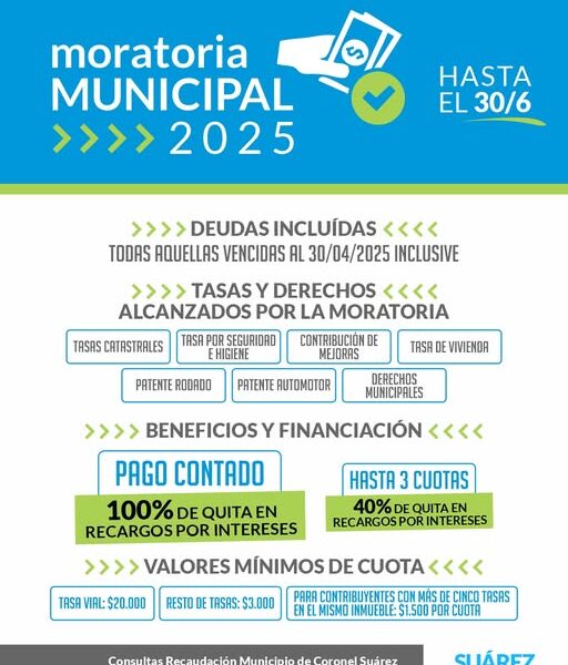 Hasta el 30 de junio de 2025, estará vigente la Moratoria Municipal 2025 (Ordenanza N° 8366), un plan especial de regularización de deudas que busca facilitar a los vecinos el cumplimiento de sus obligaciones tributarias, brindando importantes beneficios y descuentos en los recargos por mora.