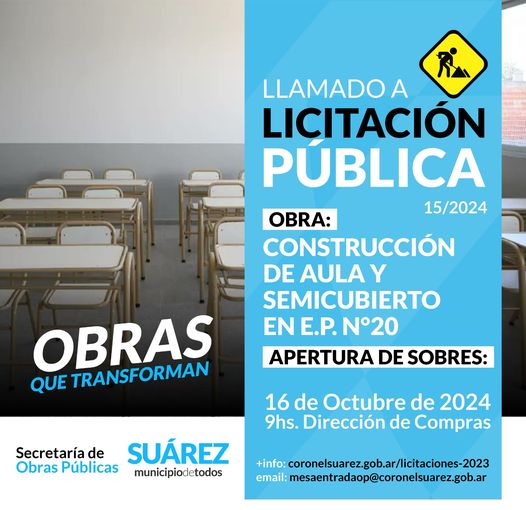 APERTURA DE OFERTAS: MIERCOLES 16 DE OCTUBRE DE 2024 – 9:00 Hs. Dirección de Compras de la Municipalidad de Coronel Suárez- Rivadavia 165-Coronel Suárez