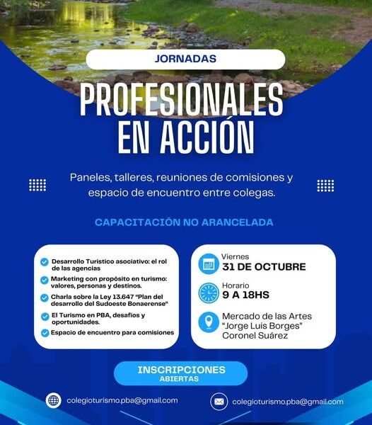 Desde la Subdirección de Turismo del Municipio de Cnel. Suárez junto con 5 Profesionales Colegiadas de nuestra ciudad, y estudiantes de la Tecnicatura Superior en Turismo del I.S.F.D y T. N°160 estamos organizando estas Jornadas de Capacitación “Profesionales en Acción” impulsadas por el Colegio de Profesionales de Turismo de la Provincia.