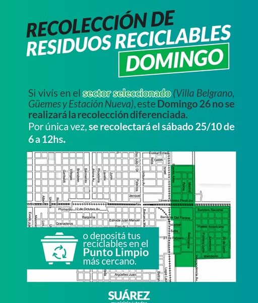 Se informa a los vecinos de Villa Belgrano, Güemes y Estación Nueva que, debido a un inconveniente con un camión, la recolección de materiales reciclables que debía realizarse el domingo se adelantará por única vez al sábado 25 de octubre.