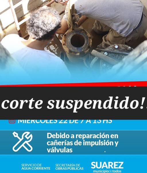 Desde la Secretaría de Obras Públicas informa que se SUSPENDE el CORTE TOTAL DE AGUA programado para el día de mañana.
