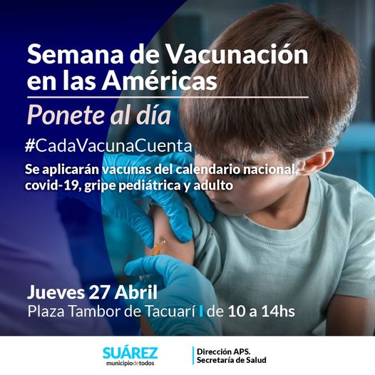 Este jueves 27 de abril, de 10 a 14, acercate a completar el calendario de vacunación, en la Plaza Tambor de Tacuarí. Se estarán aplicando vacunas del calendario nacional, covid-19, gripe pediátrica y adulto.