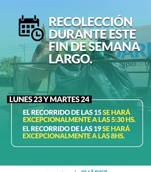 La secretaria de Servicios Públicos informa a la comunidad que los días lunes 23 de marzo día no laborable con fines turísticos y martes 24 de marzo feriado nacional por el Día Nacional de la Memoria por la Verdad y la Justicia; el servicio de recolección de residuos domiciliarios se prestará de la siguiente manera: