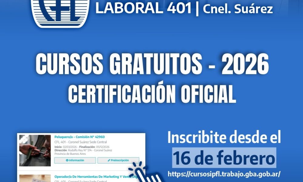 Destacados TALLERES 2026 EN EL CFL TALLERES 2026 EN EL CFL 04/02/2026 El Centro de Formación Laboral N° 401 de Coronel Suárez presenta la variada propuesta de capacitaciones para los talleres 2026. Related Itemsdestacar Destacados 04/02/2026 Related Itemsdestacar