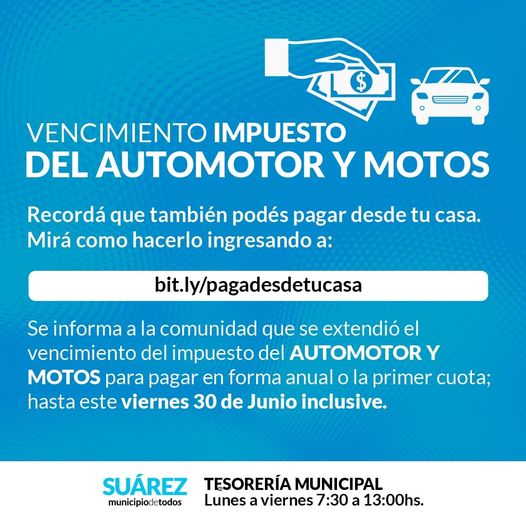 ????????Se informa a la comunidad que se extendió el vencimiento del impuesto del AUTOMOTOR Y MOTOS para pagar en forma anual o la primer cuota; hasta este viernes 30 de junio inclusive.