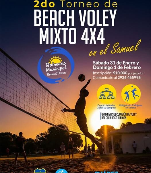 Con el acompañamiento de la dirección de Deportes del Municipio de Coronel Suárez, la subcomisión de Vóley del Club Boca Juniors organiza la 2° edición del Torneo de Beach Vóley Mixto 4×4, que se disputará el sábado 31 de enero y domingo 1° de febrero.