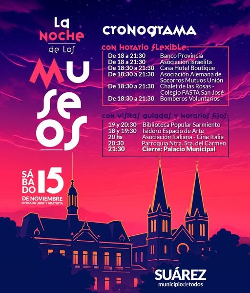 Este sábado 15 a partir de las 18 horas, Coronel Suárez vivirá la 2° edición de “La Noche de los Museos”, un evento que invita a recorrer los espacios históricos, culturales y patrimoniales del distrito desde una mirada diferente. Un proyecto impulsado por la Jefatura de Gabinete, encabezada por Mauro Moccero y que año tras año se enriquece y fortalece, porque Coronel Suárez “tiene grandes historias por contar”. 🎟 Entrada libre y gratuita